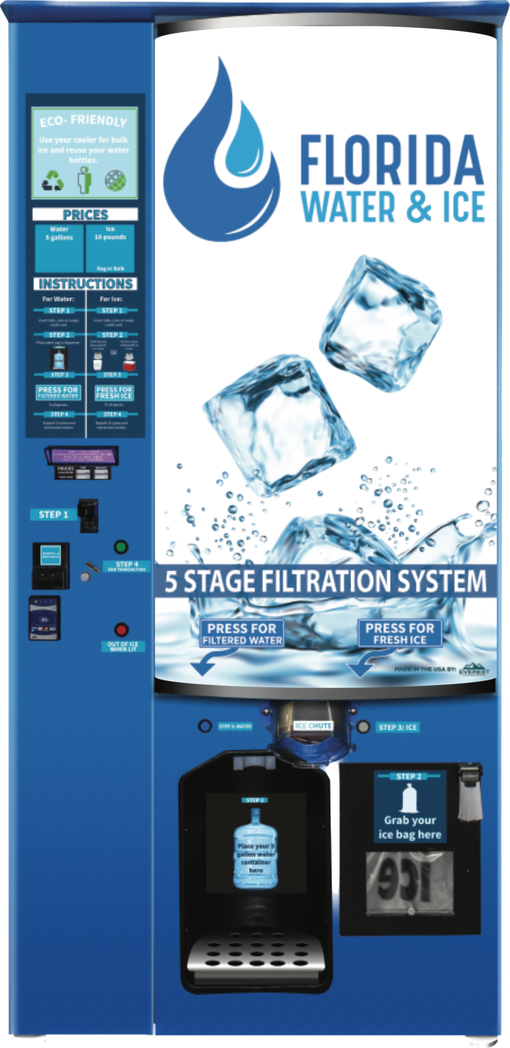When it comes down to being sure that the water used to make your bag of ice is safe to consume, ice vending machines make great sources to grab your clean ice bags. Ice vending machines with a good filtration process are mostly self-service, which is less likely to become contaminated. With Florida Water and Ice Systems, we provide many solutions for clean purified water for ice use. Our ice vending machines perform with a five-stage filtration system that operates by removing any sediment larger than half a micron in size and filters the water through back-to-back solid block carbon filters to remove chlorine, contaminants, and odor. We also use advanced UV light that sterilizes the water.